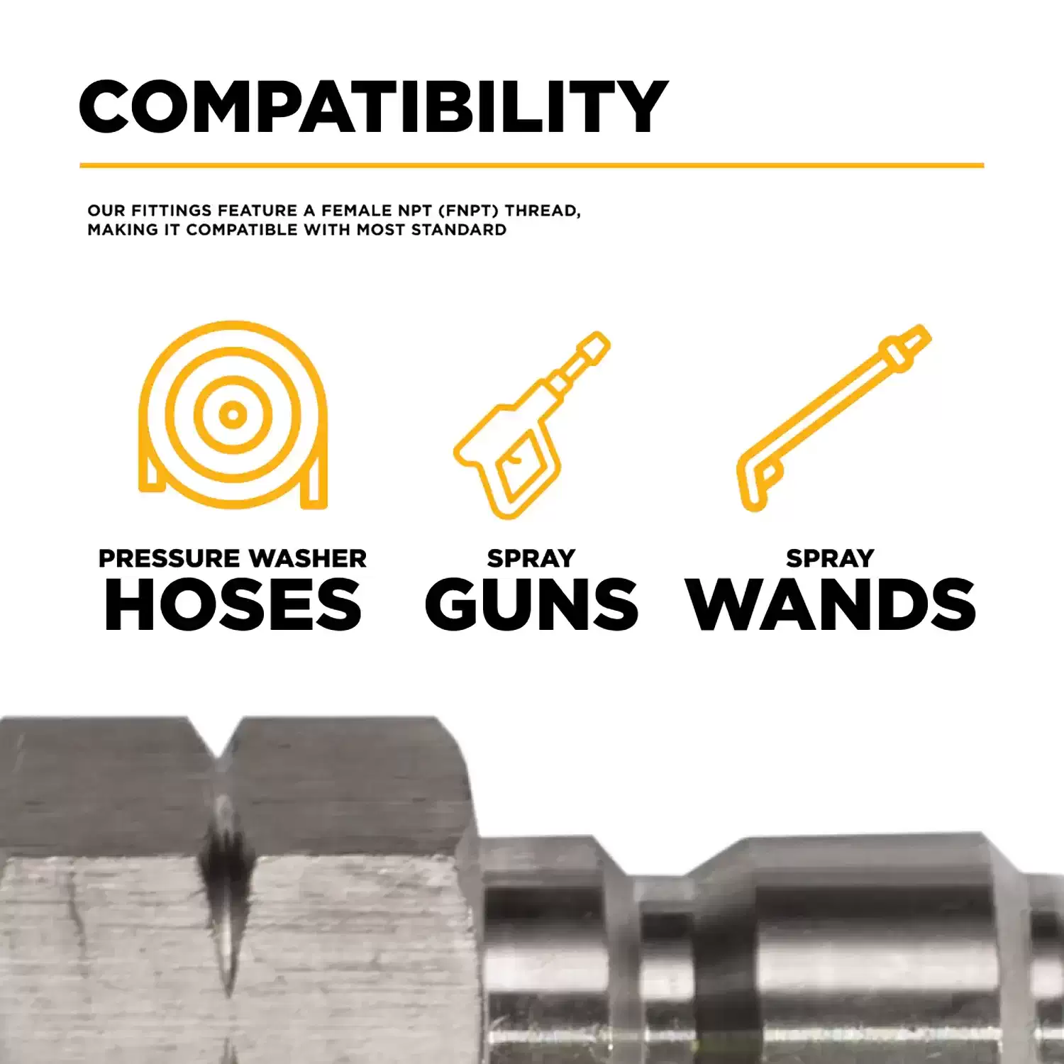 It is also a practical choice for users searching for a 3/8″ pressure washer plug, stainless steel quick connect plug, or high-pressure pressure washer fitting that can support commercial and residential cleaning equipment. With a 6,000 PSI rating and compatibility across common pressure washer components, it fits a wide range of cleaning applications where secure connections and long-term durability are important.