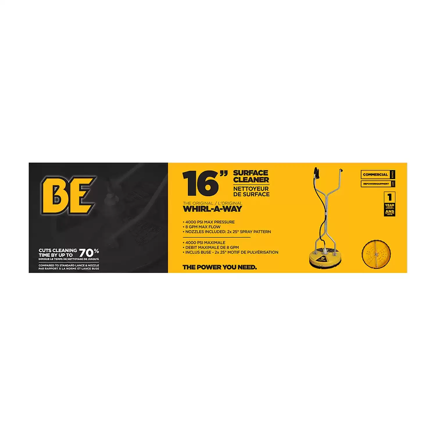 The BE Power Equipment 85.403.003 Whirl-A-Way is built for users who want to clean large surfaces faster, more evenly, and with less effort than a standard spray wand. Its 16 inch cleaning path, dual rotating jets, and commercial pressure range make it a practical choice for driveways, sidewalks, patios, and other flatwork where speed and consistency matter.