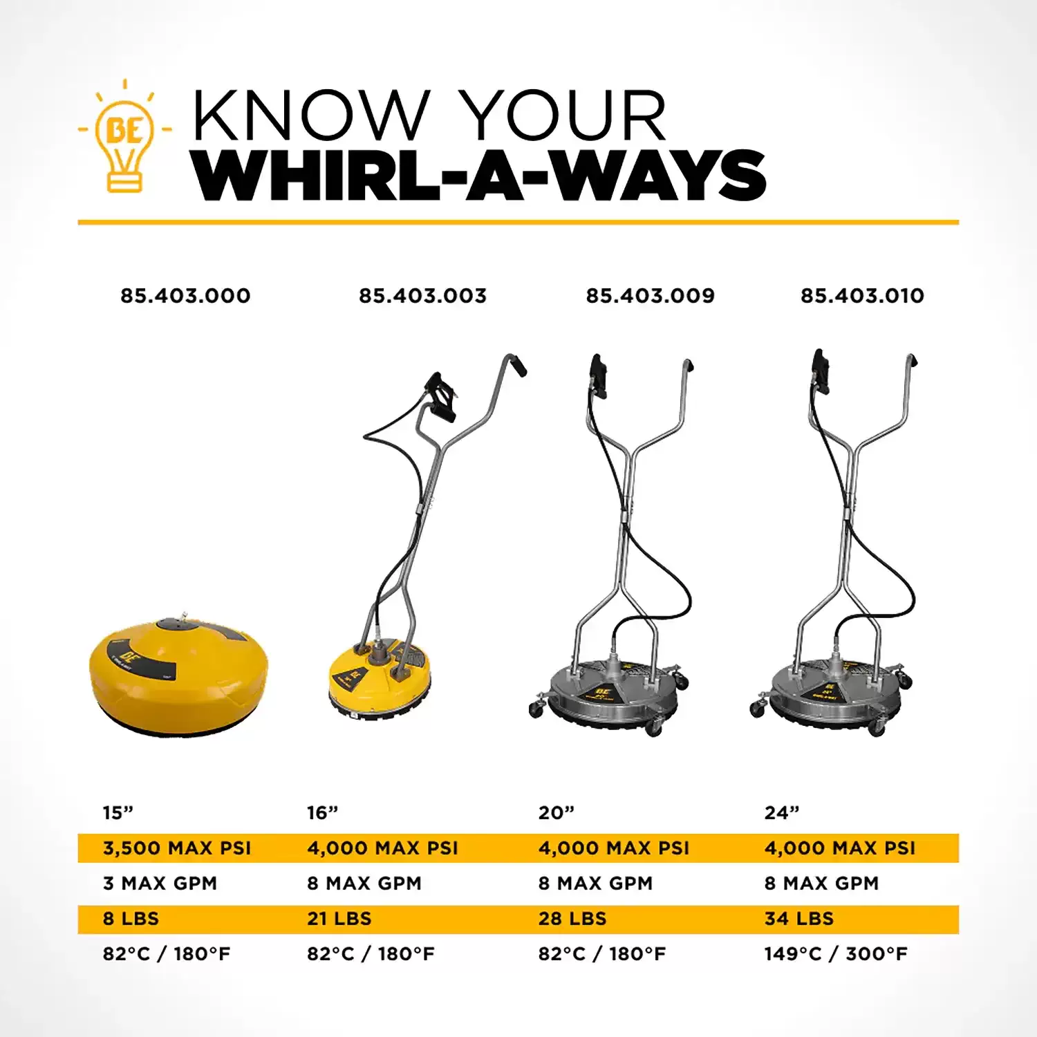 BE Power Equipment 85.403.003 16″ 4,000 PSI Whirl-A-Way Pressure Washer Surface Cleaner Specifications