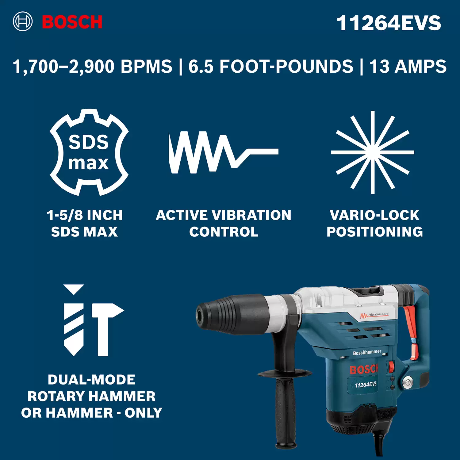 The Bosch 11264EVS SDS-max 1-5/8 In. Combination Hammer is designed for concrete contractors, renovation crews, and maintenance professionals who need strong drilling and chiseling performance in a corded platform. Bosch equips this model with a powerful 13.0 amp motor that delivers 6.5 ft.-lbs. of impact energy, while keeping tool weight at 15.2 lb for a strong performance-to-weight ratio. Its SDS-max bit system supports tool-free accessory changes and efficient energy transfer for larger concrete and masonry applications.