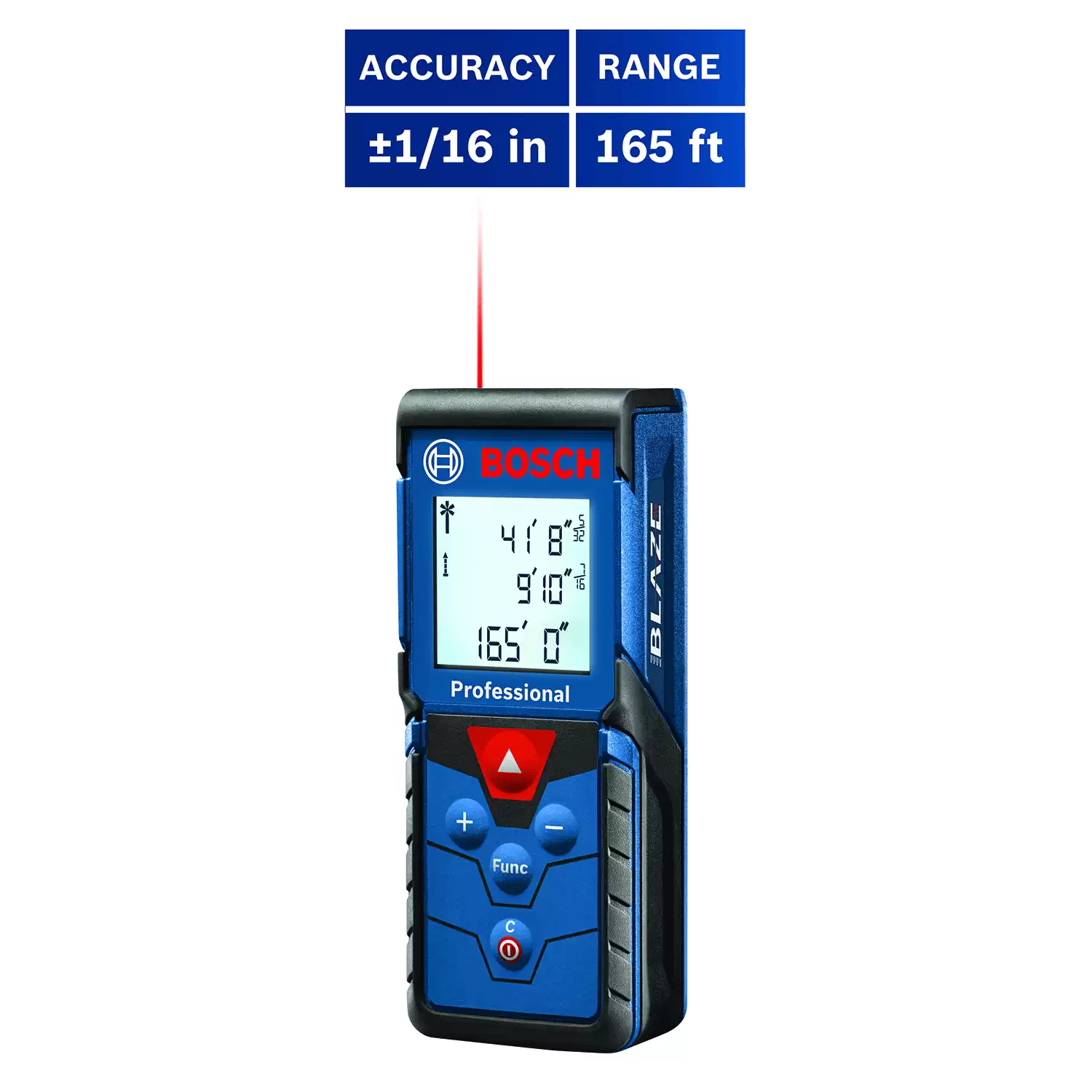 The Bosch GLM165-40 BLAZE Pro is a compact laser measure designed for quick, accurate layout and measurement work in residential, commercial, and maintenance settings. It measures up to 165 ft. with typical accuracy of ±1/16 in. and provides distance, area, volume, and indirect measuring functions in a pocket-size format. Bosch also includes a backlit display that keeps readings visible in low-light spaces and a real-time measurement mode that updates as the user moves closer to or farther from the target.