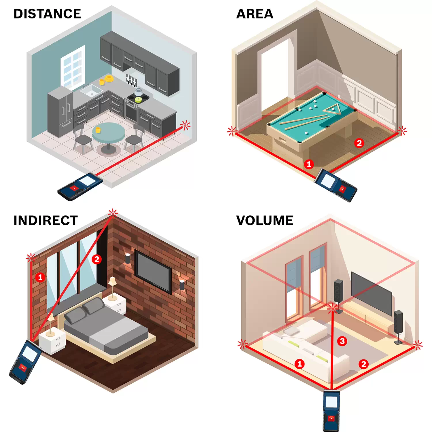 - Primary Operating Modes: Distance, area, volume, and indirect measurement