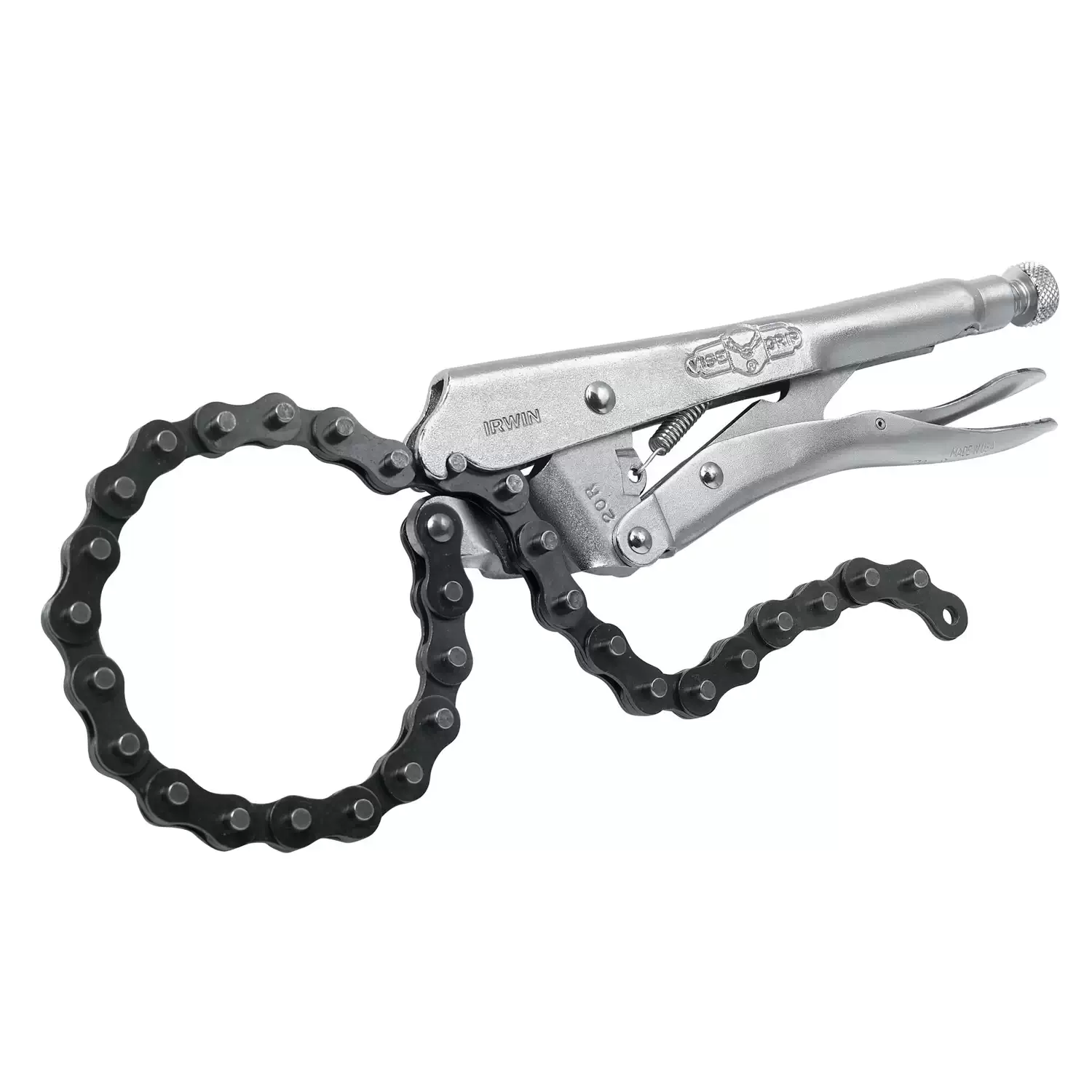 The IRWIN 20R is a classic locking chain clamp built to secure round, irregular, and awkward shapes that ordinary jaws can’t grab. A heat-treated alloy-steel body delivers strong locking force, while the wrap-around chain applies even pressure 360° around pipe, mufflers, housings, and non-parallel parts. Set the turn screw once for the required size and pressure—the clamp repeats that setting for consistent, fast setups on production or service work. The classic trigger release unlocks smoothly with one hand.