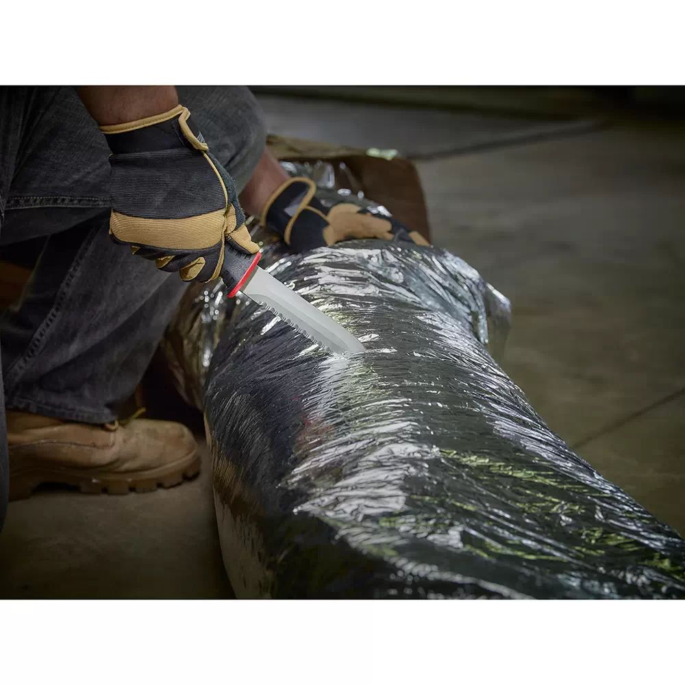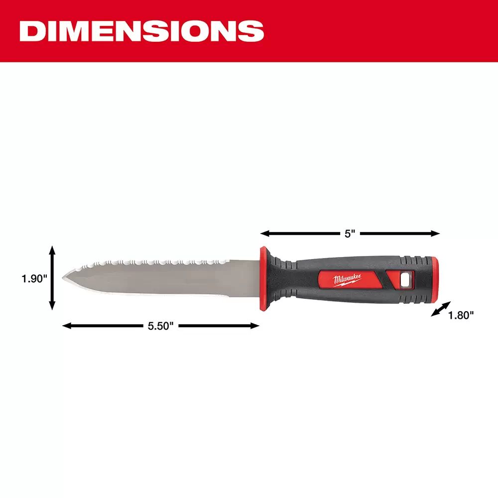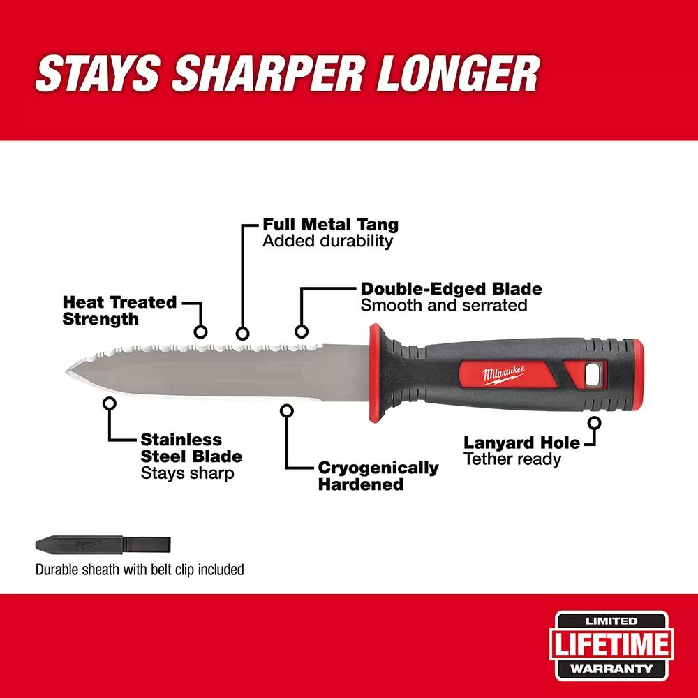 The Milwaukee duct knife is designed for optimal edge retention and durability. The stainless steel blade is engineered to stay sharper up to 5X longer when cutting flexible duct and insulation. The double edge blade allows for a wide range of applications. A full metal tang provides durability for tough cuts. Includes a durable sheath for easy carry and storage.