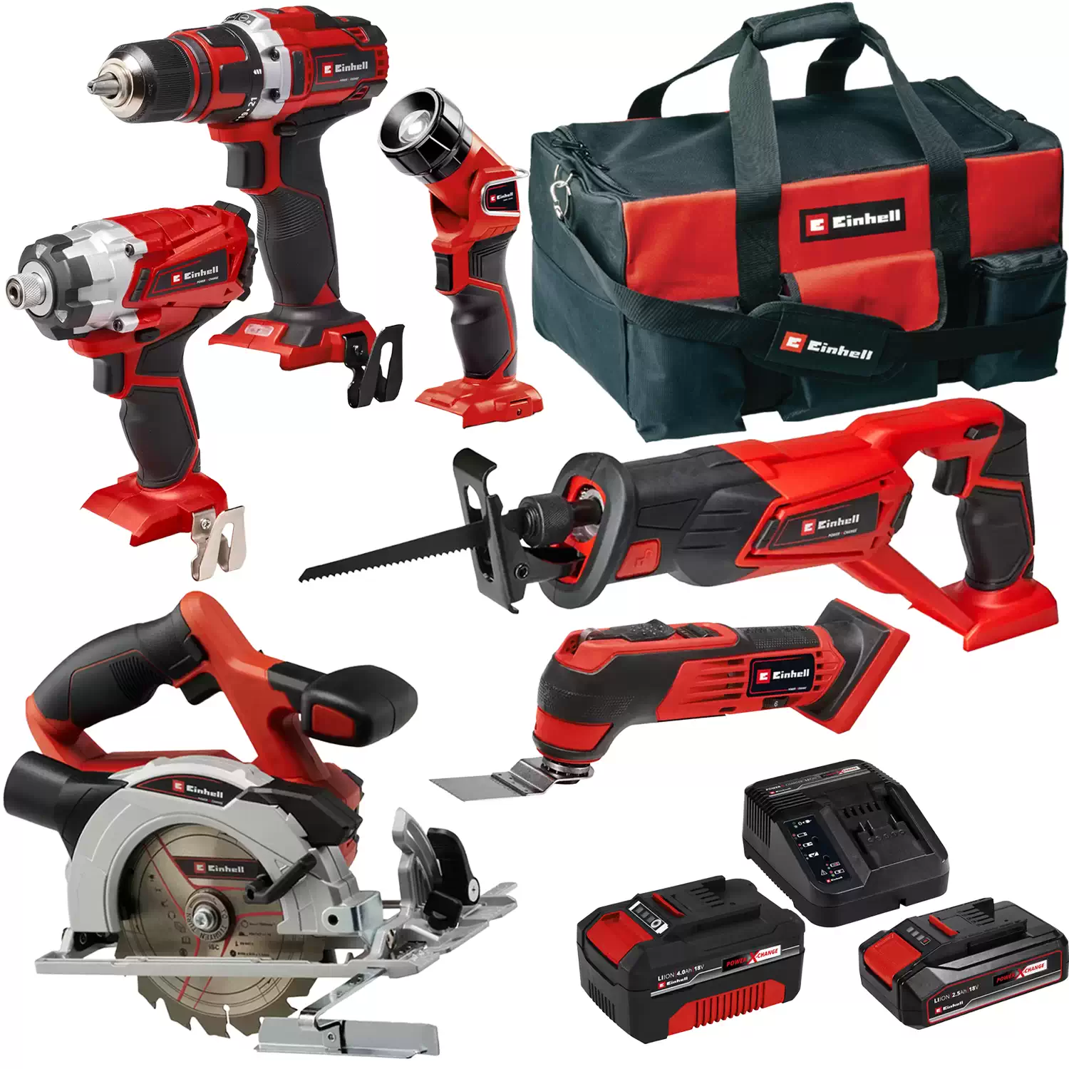 Einhell 4257246 18V Power X-Change Cordless 6PC Combo Kit with Drill, Impact Driver, Circular Saw, Recip Saw, Multi-Tool & LED Work Light