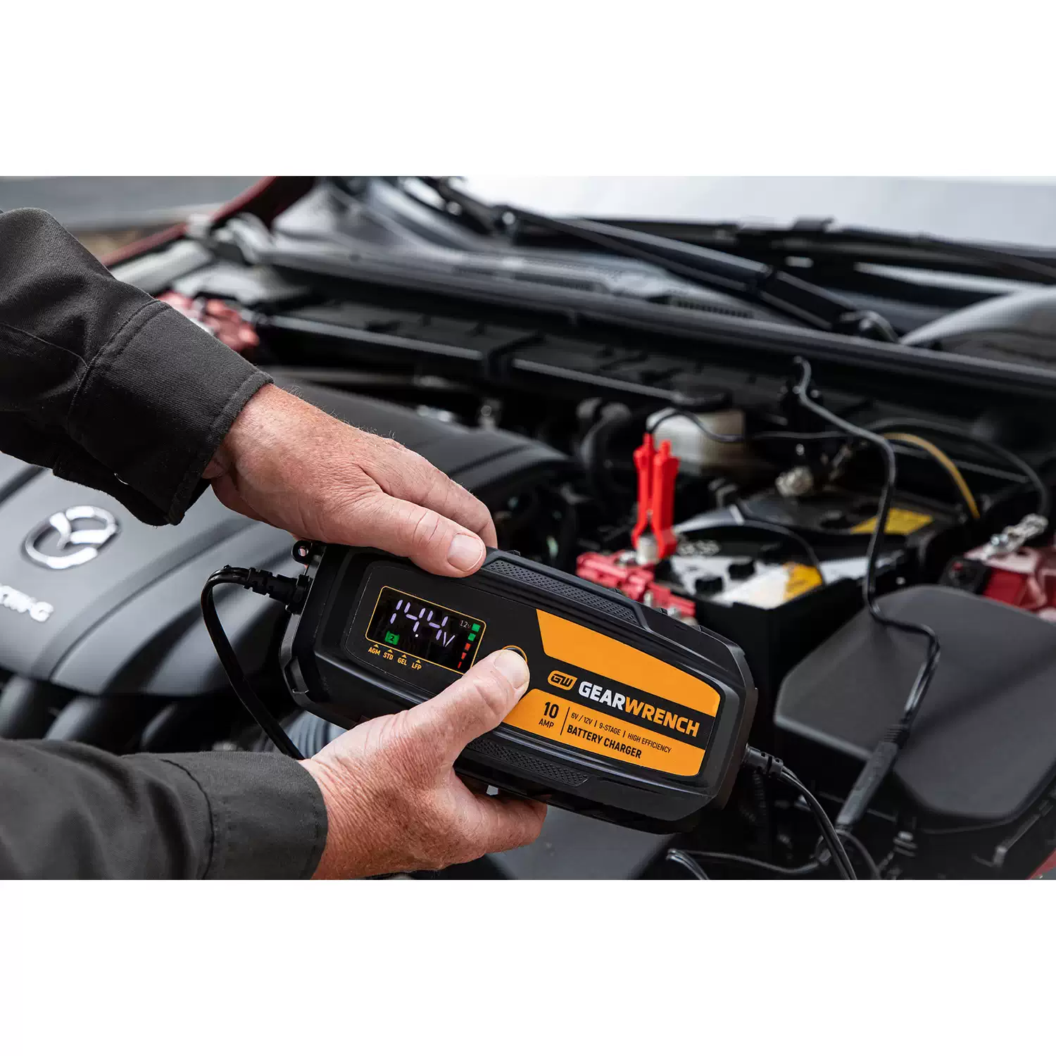 The GEARWRENCH GWBC100 is a 10A 6V/12V battery charger and maintainer built for faster charging and long-term battery care. It uses a 9-stage intelligent charging system, supports AGM, standard lead acid, gel, and LiFePO4 batteries, and features a digital display, temperature compensation, quick-disconnect leads, and an IP65-rated housing for indoor or outdoor use.