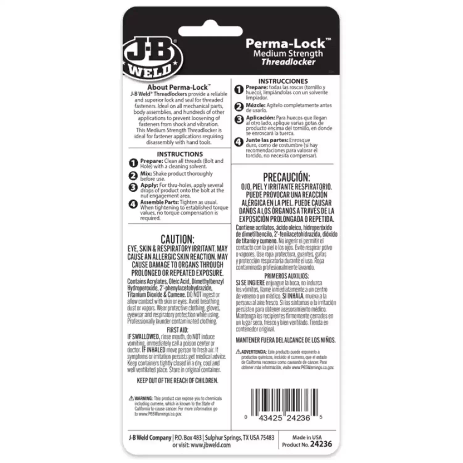 J-B Weld 24236 36ML Perma Lock Blue Medium Strength Threadlocker Specifications
