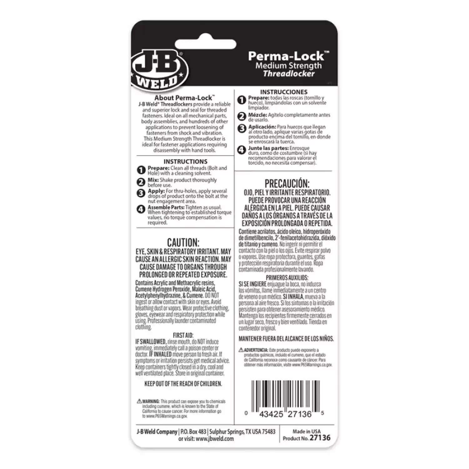 J-B Weld Perma-Lock Red (27136) is a high strength threadlocker designed to lock and seal metal fasteners that see heavy shock and vibration. The 36 mL bottle with a precision tip and no-spill, no-drip, clog-resistant cap makes controlled application easy on assemblies from suspension hardware to engine brackets. Per the packaging, it is temperature resistant to 300°F and ideal for 1/4″–1″ fasteners, giving mechanics and fabricators the holding power needed on common bolt sizes without retorquing. Once cured, it prevents loosening and helps maintain clamp load in demanding environments across vehicles, equipment, and fixtures. When service is required, heat and hand tools are needed to disassemble, allowing planned teardown without sacrificing reliability during use.