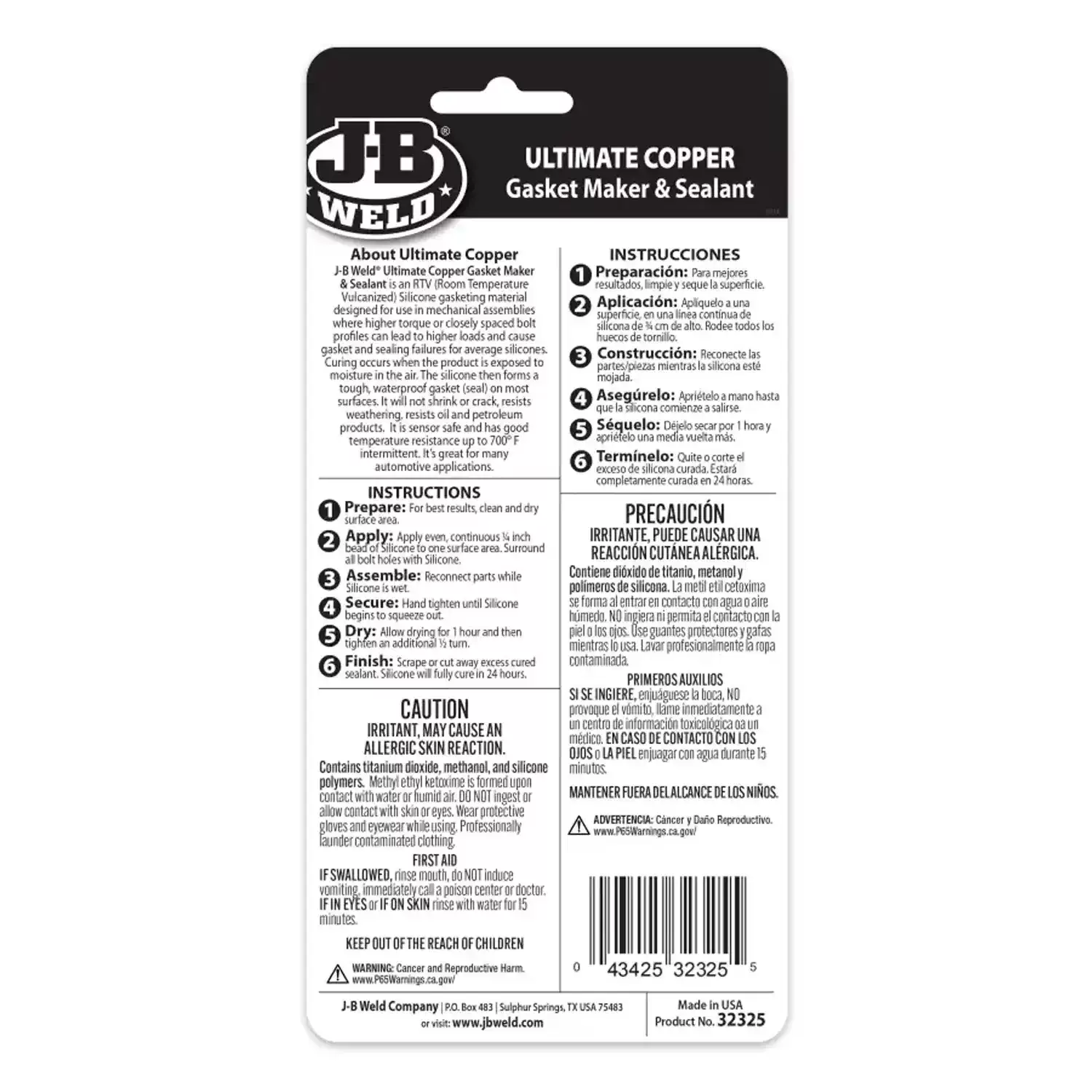 J-B Weld 32327 3oz Ultimate Grey RTV Silicone Gasket Maker & Sealant Features