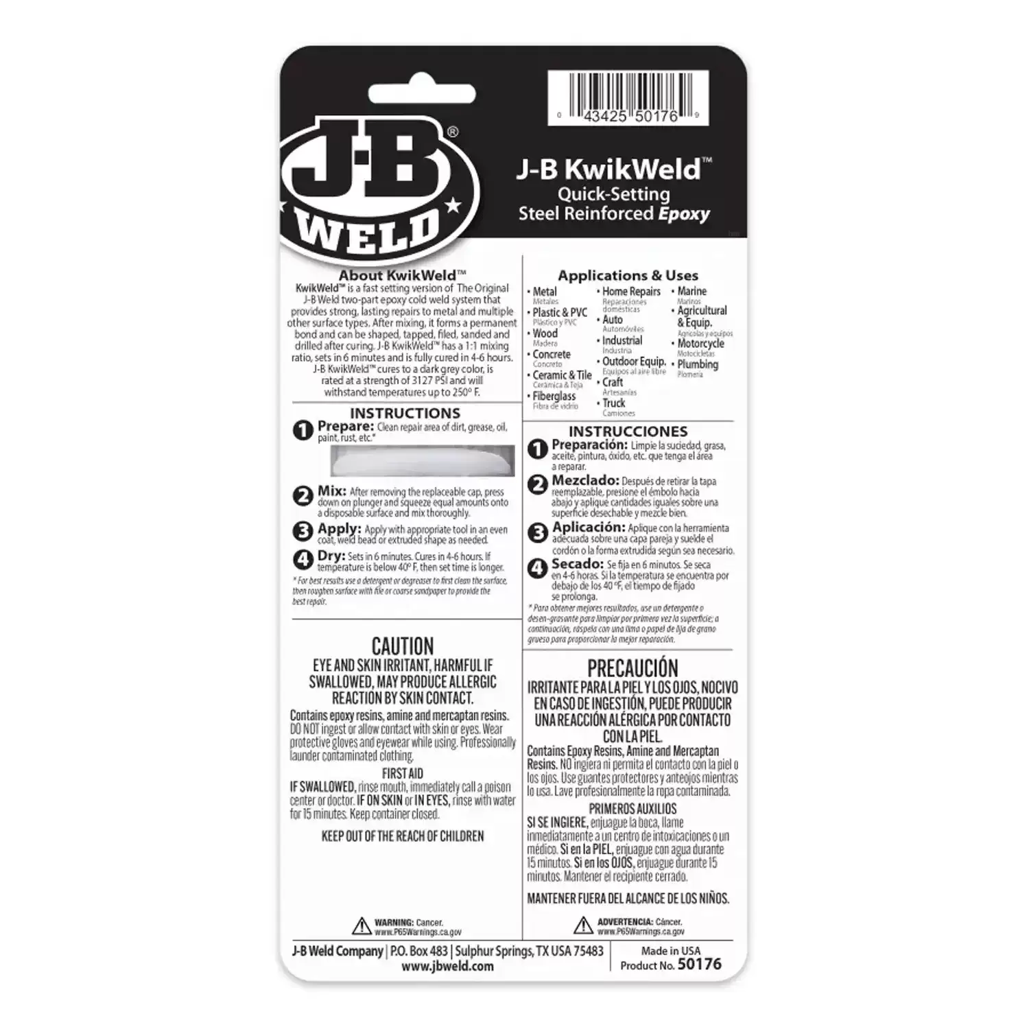 J-B Weld 50176 25mL KwikWeld Water & Oil Resistant Quick Set Epoxy Syringe Specifications