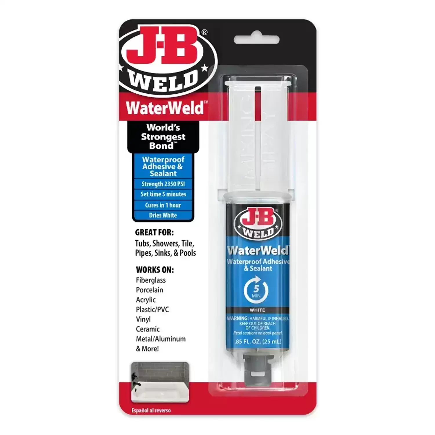 J-B Weld WaterWeld (50177) is a two-part, waterproof adhesive and sealant packaged in a dual-plunger syringe for clean 1:1 mixing. Designed for wet-area repairs, it bonds and seals on fiberglass, porcelain, acrylic, PVC/ plastic, vinyl, ceramic, wood, and common metals including aluminum and steel. From tubs and showers to pool fittings and sink surrounds, WaterWeld creates a dependable, watertight bond that sets in 5 minutes and cures in 1 hour. Once cured, it can be sanded and painted to match surrounding surfaces. The adhesive cures white and delivers up to 2,350 PSI of holding power, retaining strength above or below the water’s surface. A resealable cap prevents dry-out between jobs, and the included tray and stir stick make small-batch mixing fast and tidy.