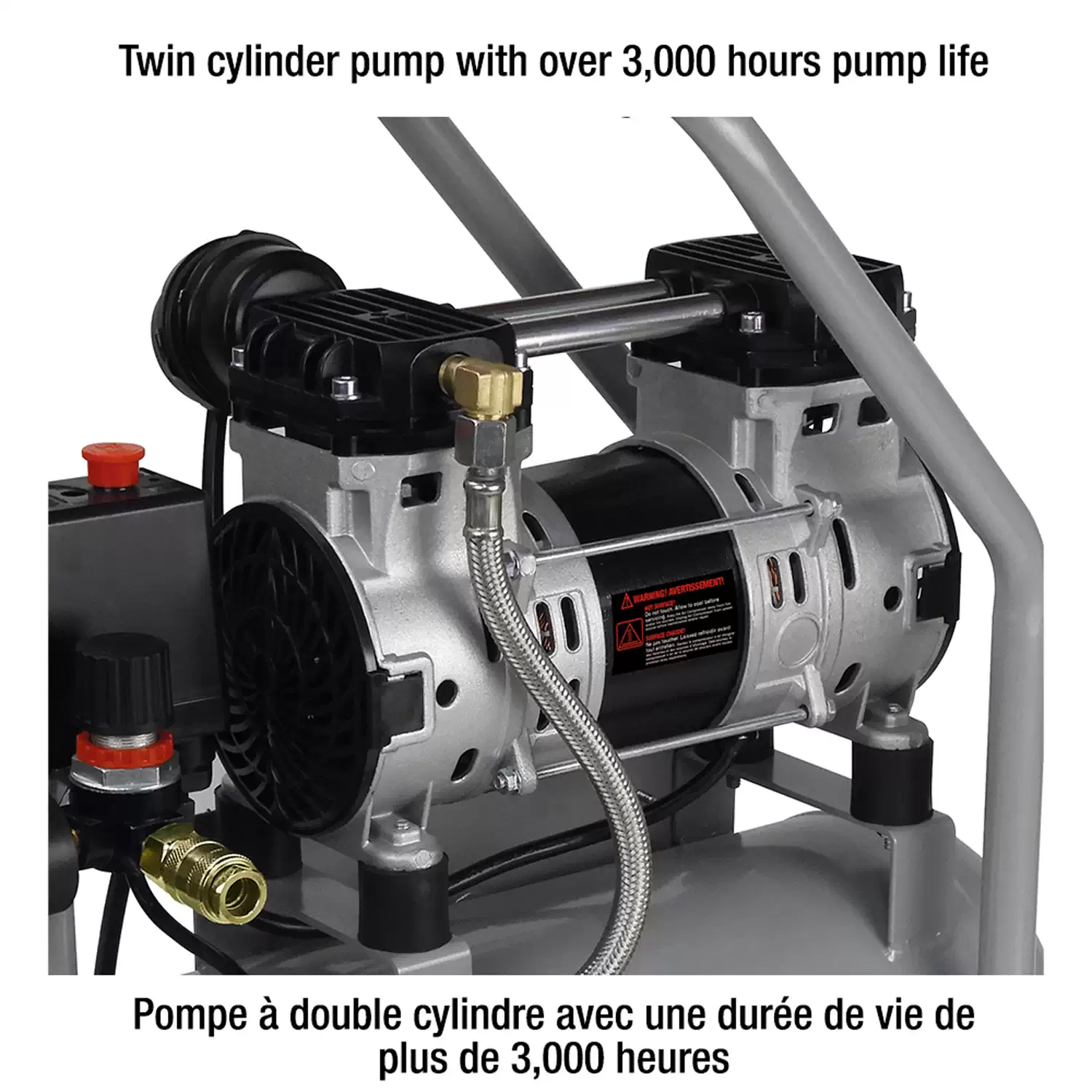 - Durable Oil-Free Pump: Oil-free twin cylinder pump reduces routine maintenance and is rated for over 3,000 hours of use.