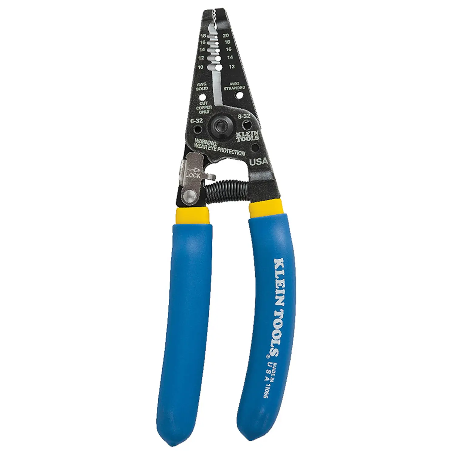 The Klein Tools 11055 is a versatile wire stripper/cutter designed for everyday electrical work on both solid and stranded copper conductors. Covering 10–18 AWG solid and 12–20 AWG stranded, it combines precision-ground stripping holes with shear-type cutting blades for clean, repeatable results. A strong-gripping, serrated nose helps bend, shape, and pull wire, while looping and bending holes make tidy hook terminals fast and consistent. The Klein-Kurve® handle design with double-dipped, curved grips improves comfort and reach in confined spaces, and a coil spring provides quick, self-opening action for faster pacing on repetitive tasks. Easy-to-read gauge markings support accurate sizing, and a closure lock secures the tool for storage in a pouch or bag. Manufactured in the USA, this 7.4-inch electrician hand tool delivers reliable stripping, cutting, and screw shearing for service calls, panel work, and bench wiring.