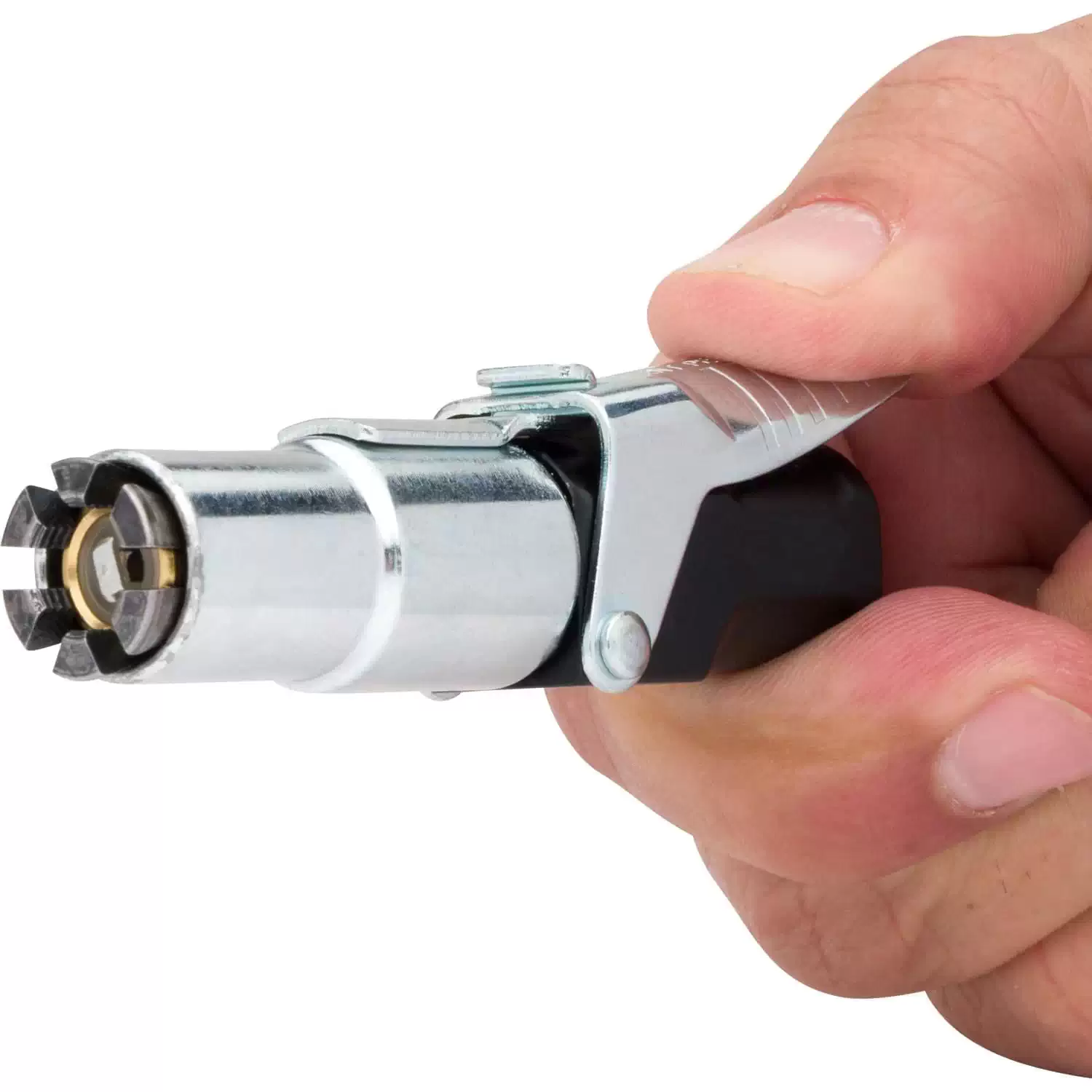 Crews pick the LNL65002 because a locking air chuck that’s closed flow works best when plumbed straight to a compressor or hose whip. The six-jaw collet clamps the Schrader valve evenly for accurate fills and fewer leaks, and the 1/4″ NPT inlet drops into existing lines. With a spring-loaded TPU seal and 150 PSI rating, it delivers steady performance in shops and on service trucks. Users get hands-free inflation, clean releases, and dependable pressure checks—exactly what’s needed for safe, repeatable tire service.