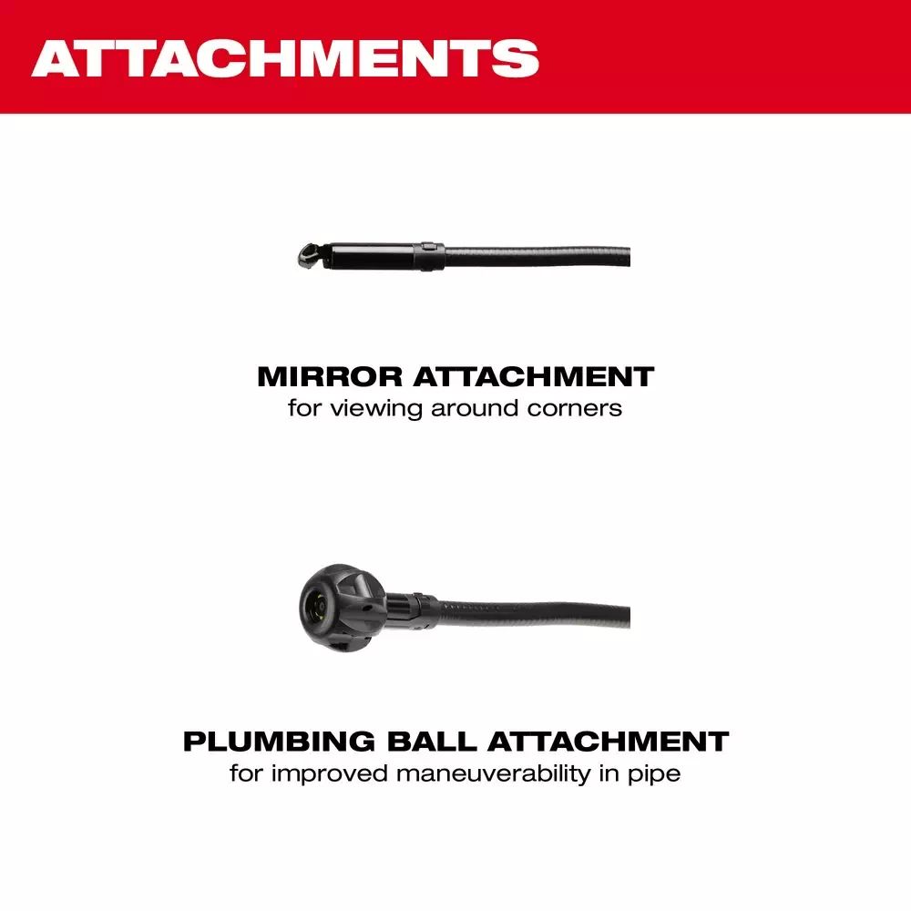 - Tool, (4) AA Batteries, (1) Plumbing Ball Attachment, (1) Mirror Attachment