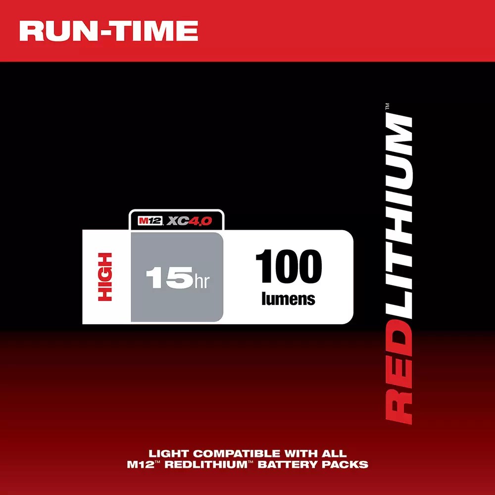 The M12 cordless LED work light outlasts and outperforms all other subcompact lights. Powered by an M12 Red Lithium battery, the work light is 2X brighter and whiter than conventional incandescent bulbs and runs up to twice as long. With a sealed aluminum head to provide impact and weather resistance, Milwaukee provides a limited lifetime LED warranty. A magnetic back allows hands-free use while a 90 degree rotating head allows the user to easily point the light beam at the desired work area.
