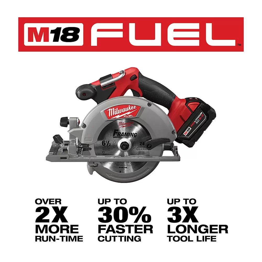 The M18 FUEL 6-1/2 in. circular saw is the fastest cutting 18 Volt cordless circular saw on the market, offering up to 30% faster cutting, 2X more run-time, and 5X the motor life of competitive saws. The POWERSTATE brushless motor provides cutting power above all other cordless circular saws, allowing applications that previously would have required a corded tool to perform. The REDLITHIUM XC 4.0 extended capacity battery pack delivers up to 2X the run-time of competitive 18 Volt tools and will provide more work per charge, and more work over the life of the pack than competitive batteries. The included REDLINK Plus intelligence system ensures optimized performance and protection from overloading, overheating, and over-discharging. The M18 FUEL 6-1/2 in. circular saw also features a cast magnesium shoe, upper and lower guards providing a durable and lightweight base. The tool also features an integrated LED light, and a rafter hook for easy storage on the job.
