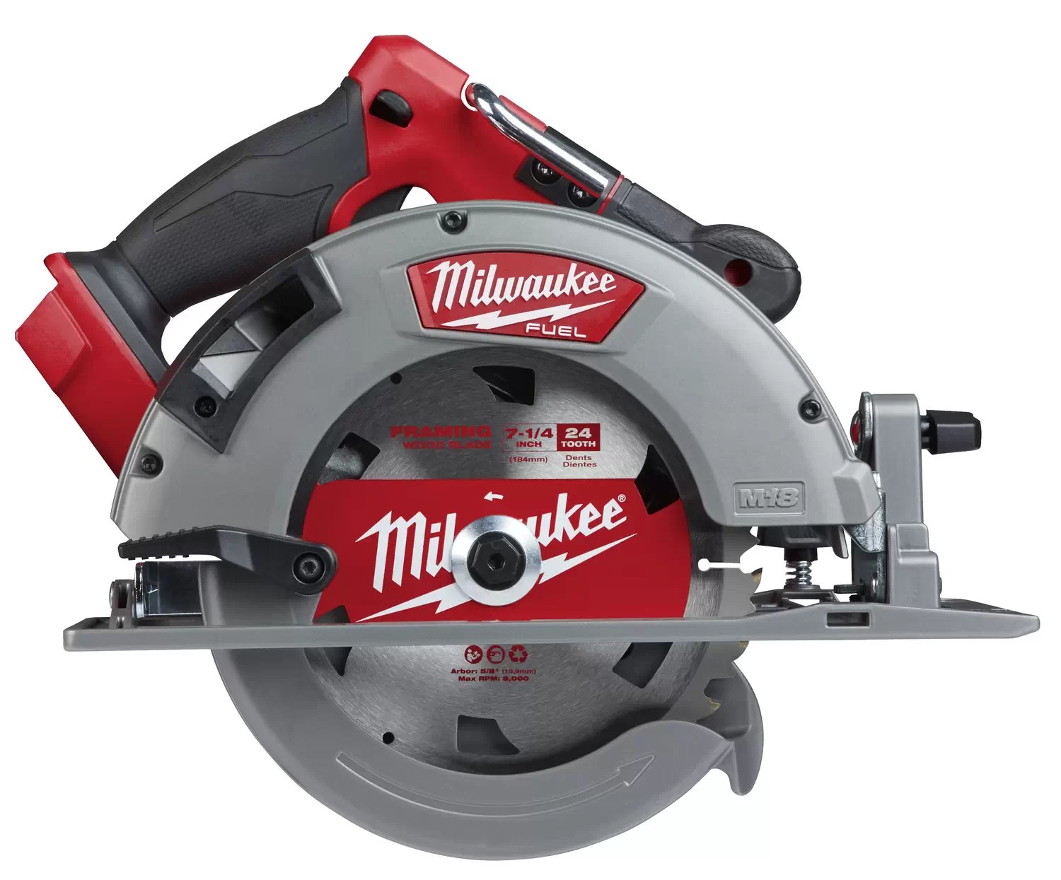 The Milwaukee 2732-20 was designed for the carpenter, remodeler and general contractor the M18 FUEL 7-1/4 in. circular saw from Milwaukee generates the power of a 15 A corded saw, cuts faster than a 15 A corded saw and gives users up to 750 cuts per charge. The POWERSTATE brushless motor provides 5,800 RPM and higher speeds under load for corded cutting performance. REDLINK Plus intelligence ensures maximum performance and protection from overload, overheating and over discharge. The M18 REDLITHIUM HIGH OUTPUT HD12.0 battery (sold separately) delivers unmatched run-time in all applications. All magnesium guards and shoe delivers extreme durability for jobsite conditions. A built-in rafter hook offers quick and easy storage and an electric brake stops the blade quickly after cuts are complete for maximum productivity.