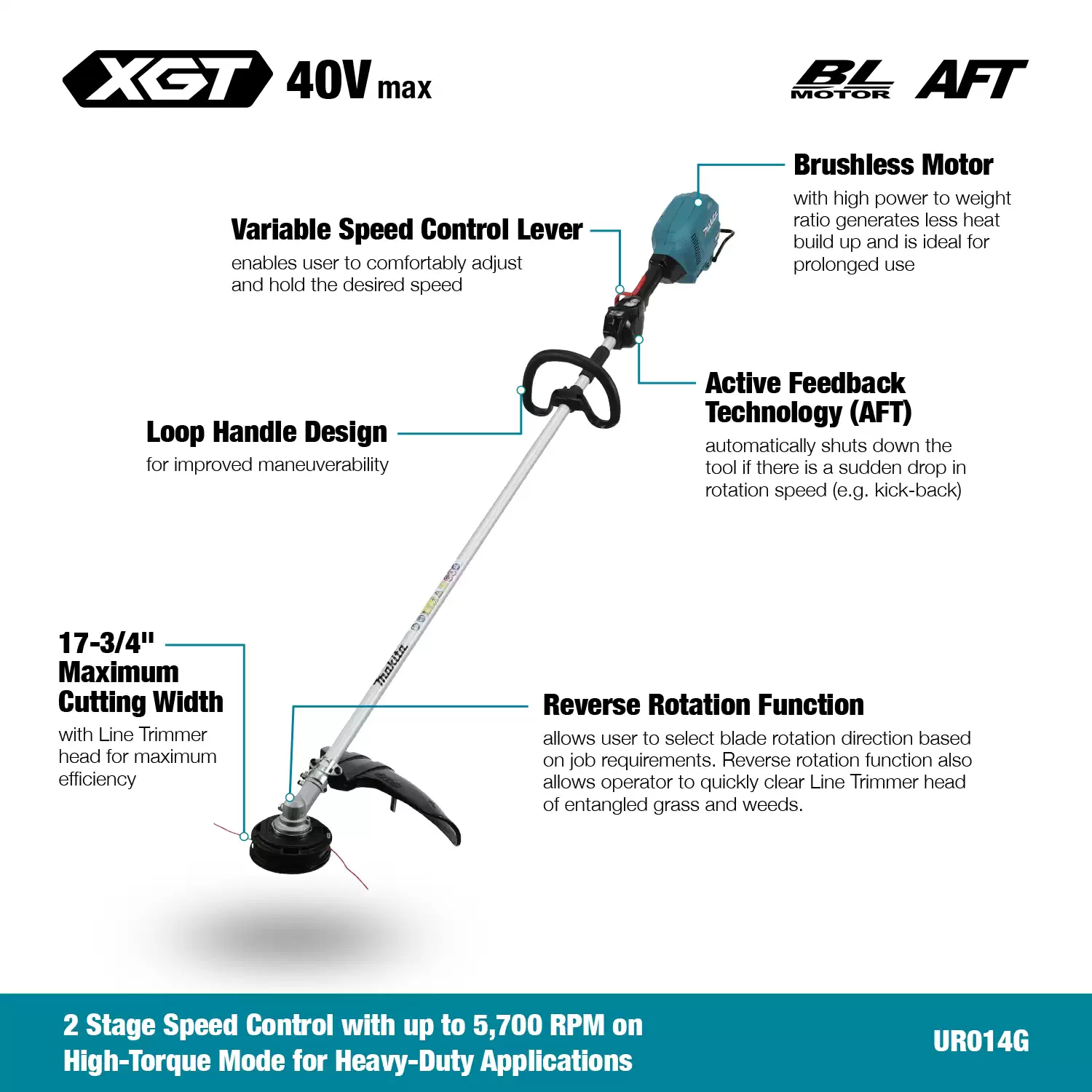 Makita UR014GT202 40Vmax XGT Cordless Brushless 17-3/4″ Line Trimmer Kit (2) 5AH Features