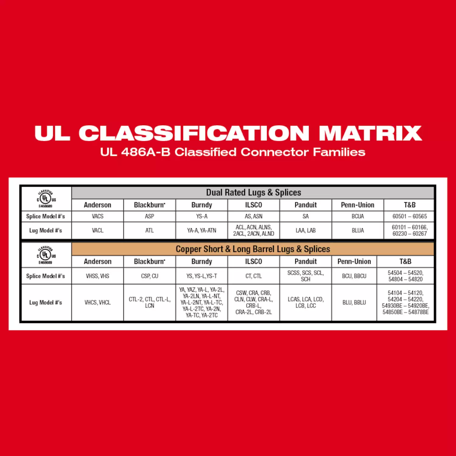 - cULus Classified Results: Meets UL 486A-B when used with Milwaukee U-Style dies on #8–750 MCM Cu and dual-rated connectors.