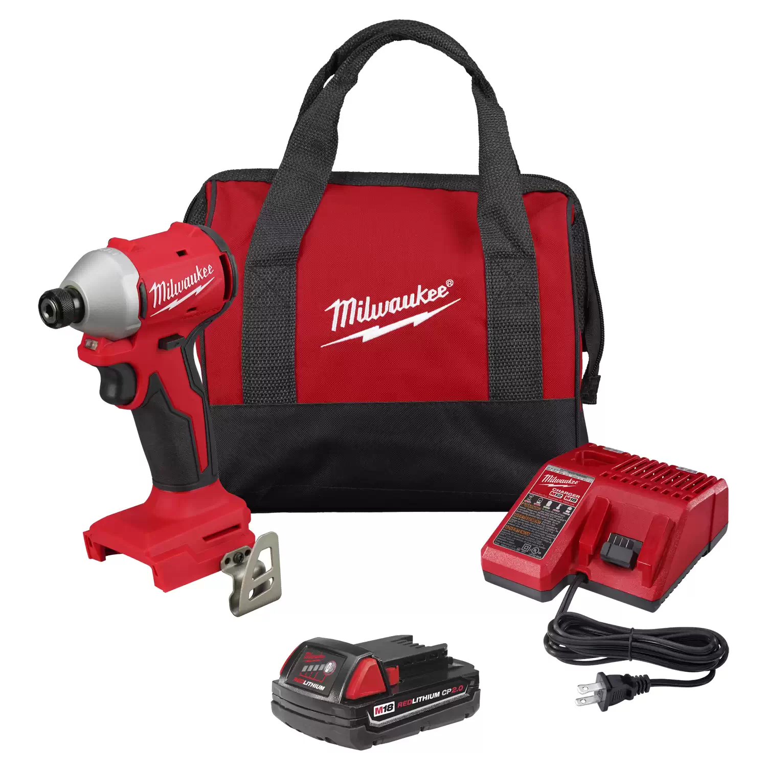 - Includes: M18 Compact Brushless 1/4″ Hex Impact Driver (3650-20), (1) M18 REDLITHIUM CP2.0 Battery Pack (48-11-1820), M18/M12 Multi-Volt Charger (48-59-1812), Contractor Bag