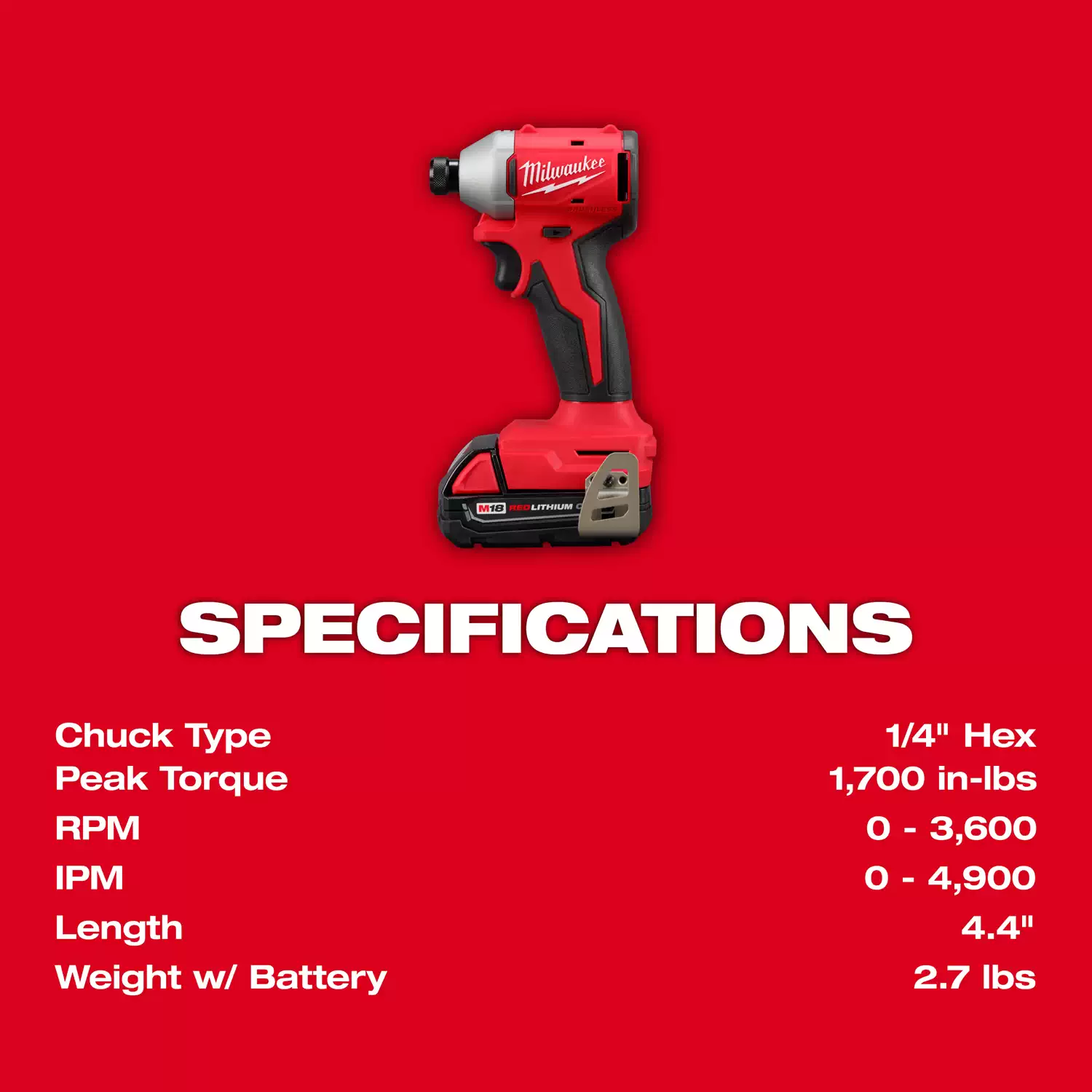 Milwaukee 3650-21P M18 Compact Brushless 1/4″ Hex Impact Driver Kit (1) 2AH Specifications