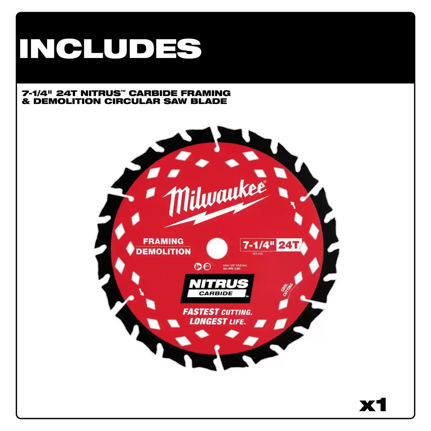 - (1) 7-1/4″ 24-Tooth NITRUS™ Carbide Framing & Demolition Circular Saw Blade
