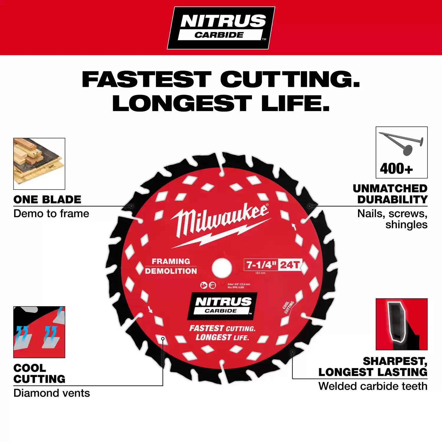 Milwaukee 48-40-0750 7-1/4″ 24T NITRUS Carbide Framing & Demolition Circular Saw Blade Features