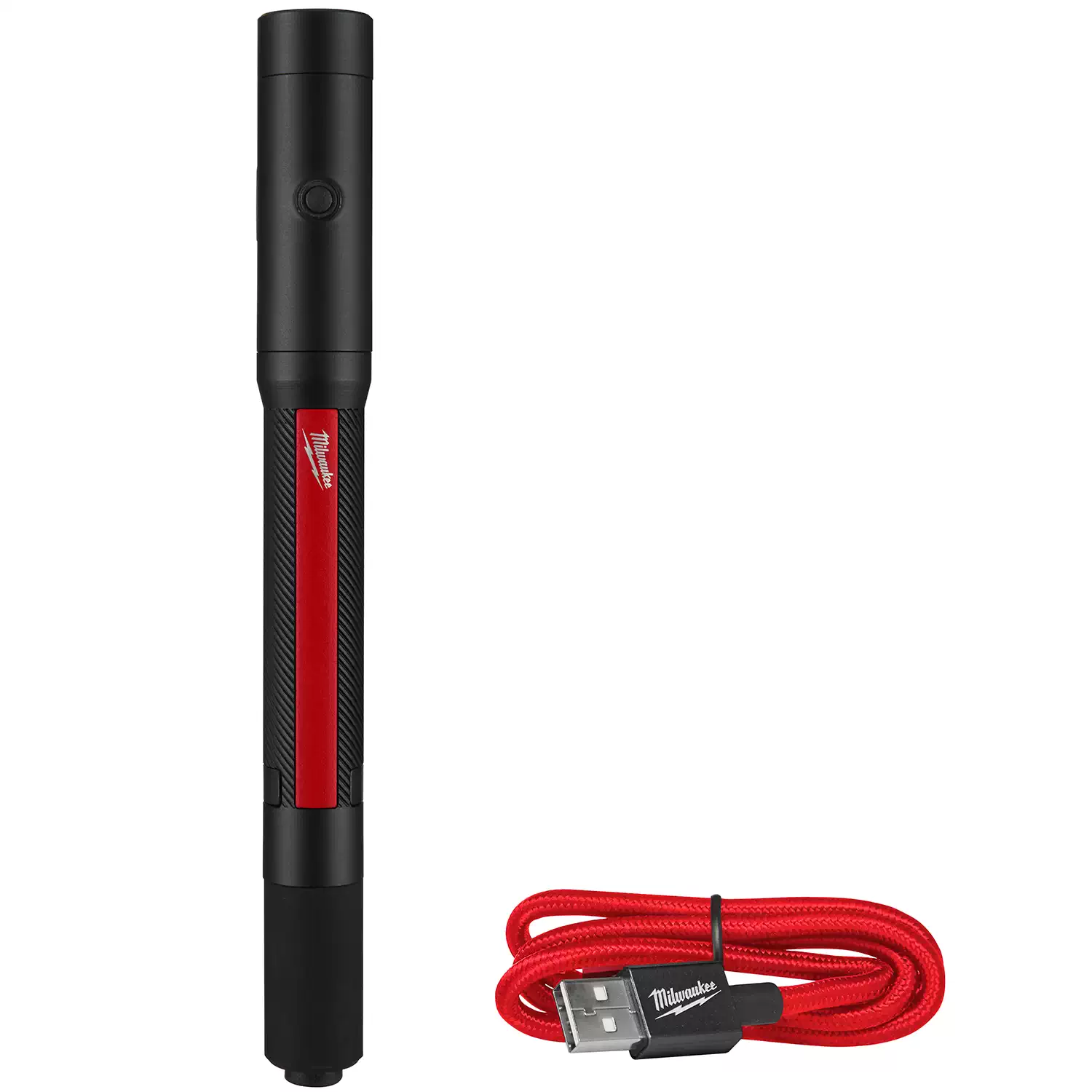 The MILWAUKEE Rechargeable 250L Penlight w/ Laser offers faster, more accurate inspections. This rechargeable penlight delivers 250 lumens of TRUEVIEW HIGH DEFINITION OUTPUT, and an integrated laser pointer ensures faster inspections and accurate communication on the jobsite. A built-in protective rubber bite zone allows for quickly directing light while performing two-handed tasks. With two output modes, get the optimal light or run-time up-to 8 hours for any task. Stay ready from job-to-job with USB charging and an on-board battery indicator. The removable metal clip offers a secure attachment to shirts or pant pockets for reliable storage. This penlight with laser pointer is built to survive the toughest jobsite conditions with an IP67 water and dustproof rating and withstands impacts up to 2 meters. The Milwaukee Rechargeable 250L Penlight w/ Laser’s built-in battery gives high performance and rechargeable capabilities where compact size is critical. The Milwaukee Rechargeable 250L Penlight w/ Laser is covered by a 2-year warranty.
