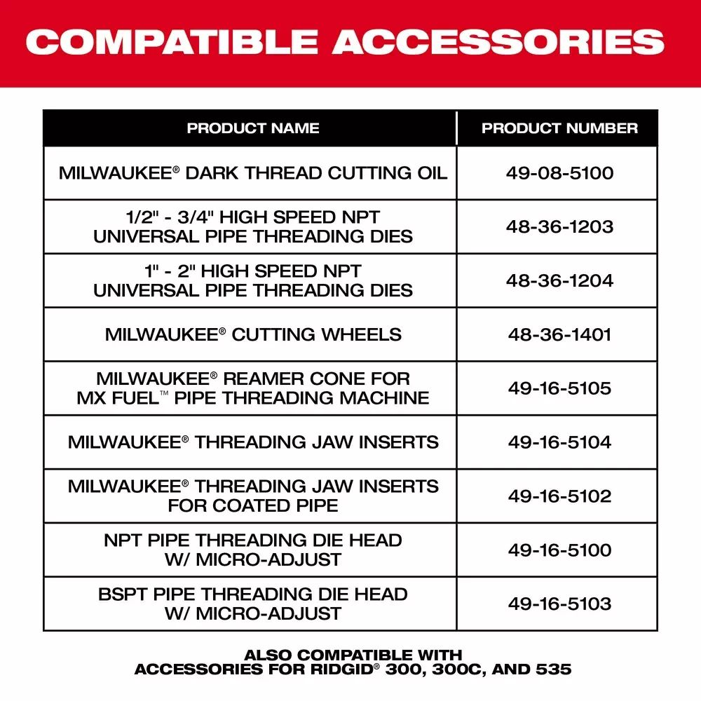 Milwaukee MXF512-2XC MX FUEL Pipe Threading Machine Specifications