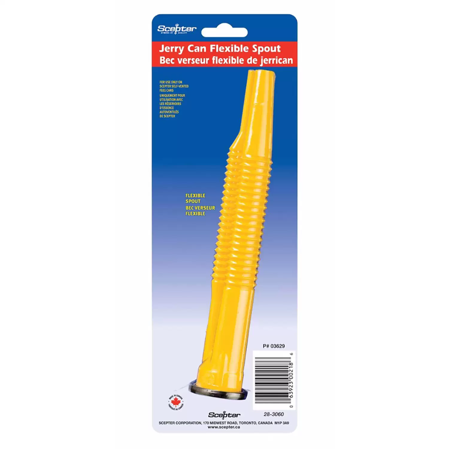 The Scepter 03629 Replacement Flexible Pour Spout is designed as a direct replacement for non-Eco Scepter fuel cans used in Canadian and international markets. This self-venting spout is engineered specifically for Scepter self-vented fuel cans, providing controlled fuel flow and a secure, leak-free connection during pouring. It is intended strictly for use with compatible Scepter cans and is not designed for universal or cross-brand applications.