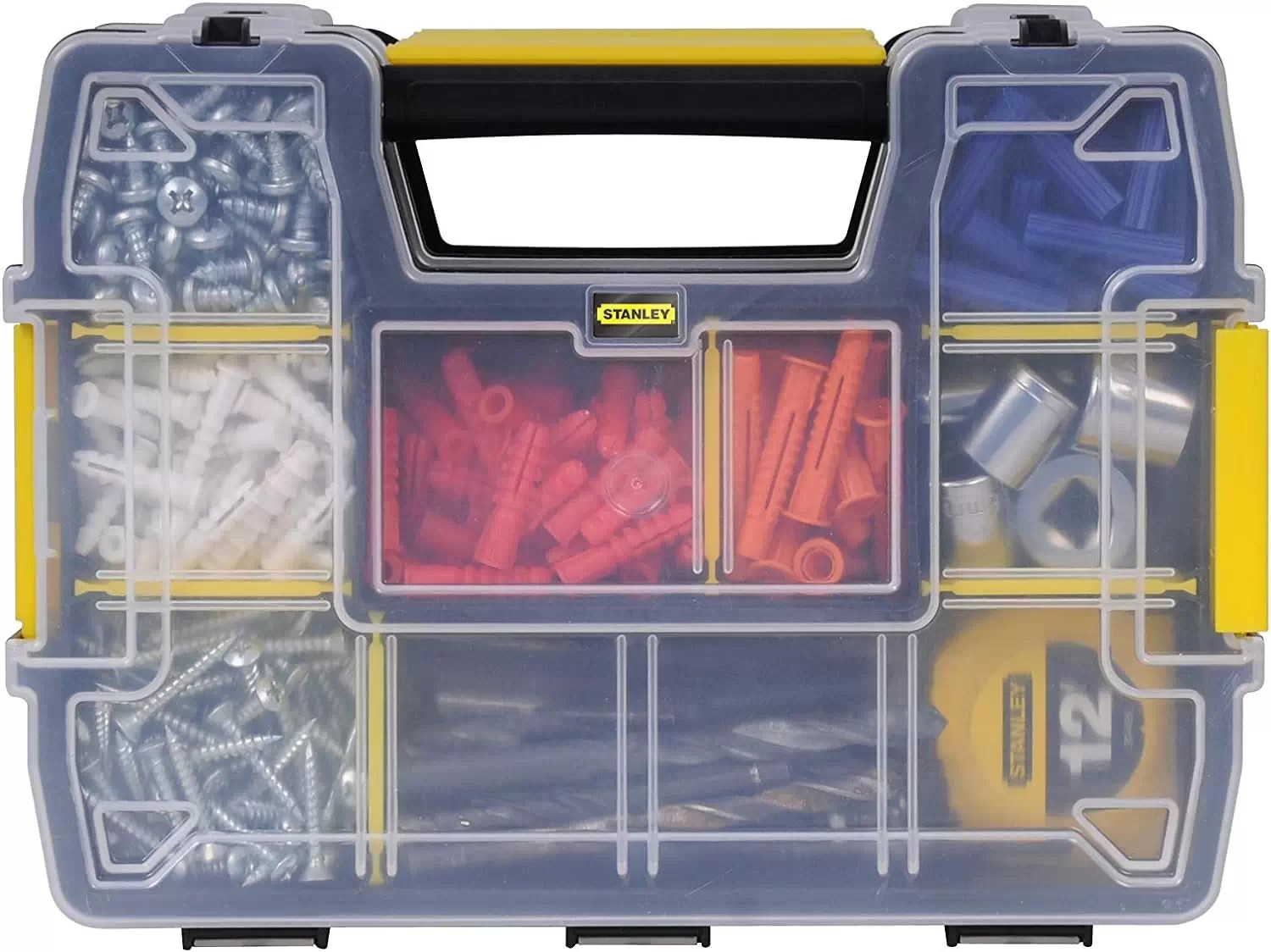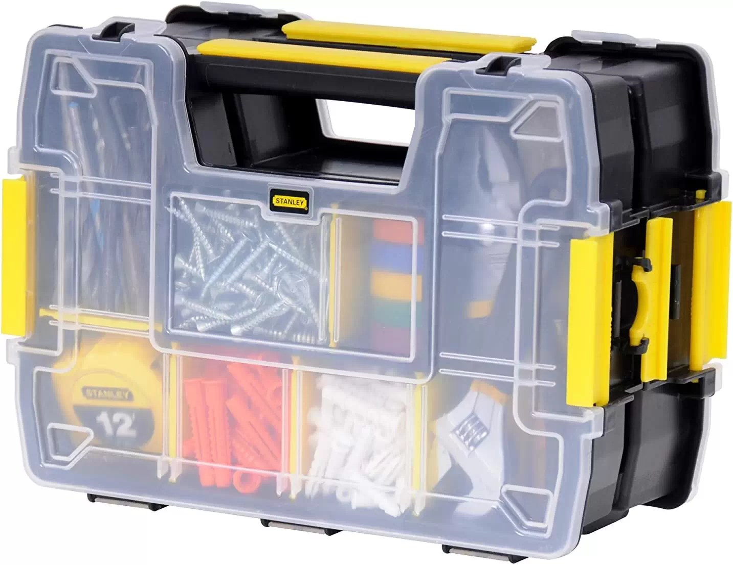 Customers appreciate the Stanley STST60961 SortMaster Junior Tool Organizer for its practicality and versatility. Its ability to keep small parts and tools neatly organized, combined with its durable design, makes it a favorite among professionals and DIY enthusiasts alike. The customizable compartments and stackable design provide significant convenience for transport and storage, ensuring that tools are always accessible and organized, whether on the job site, in the workshop, or at home. The ergonomic handle and secure locking mechanisms enhance the overall user experience, making it a reliable choice for anyone needing an effective organizing solution.