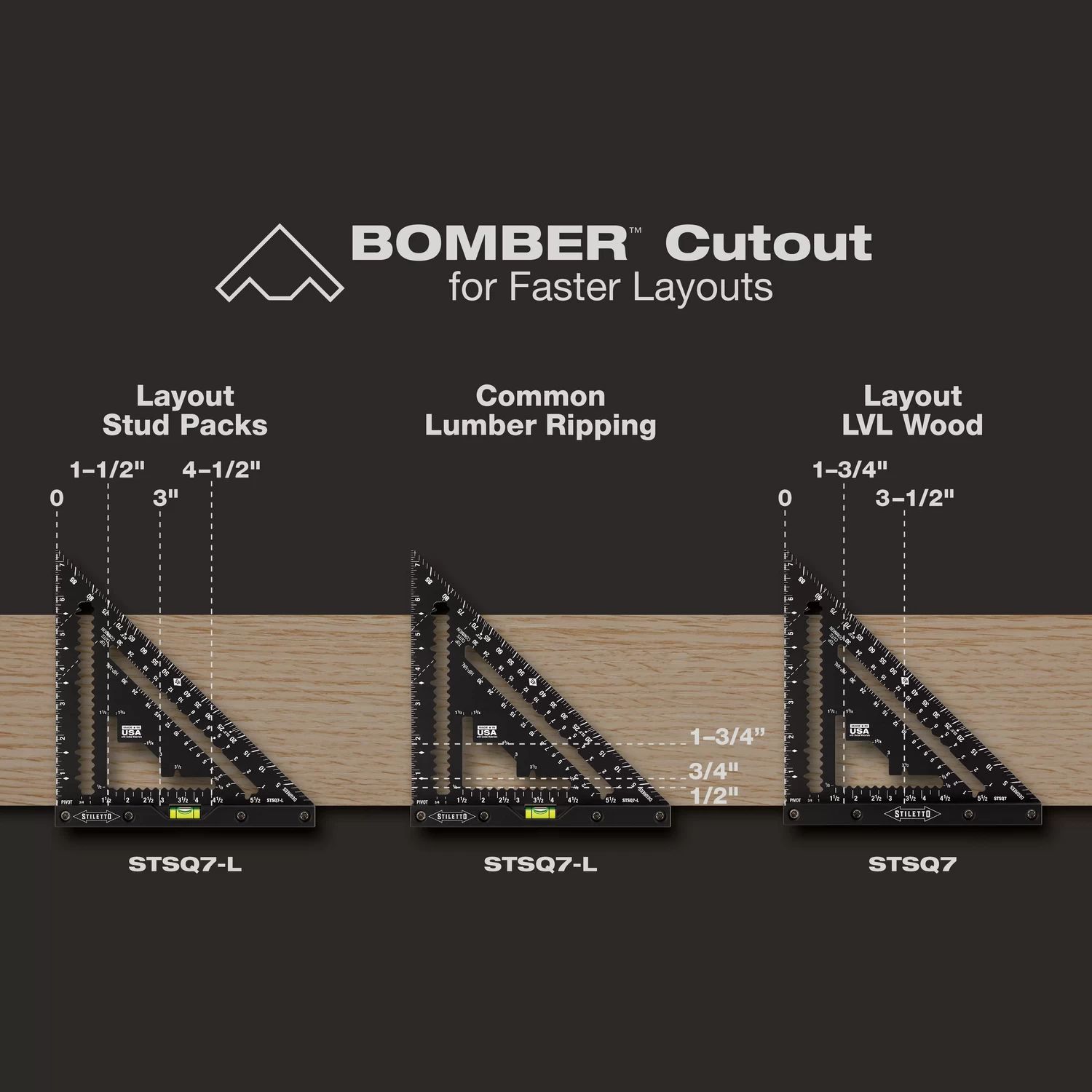 - BOMBER™ Cutout for Faster Layouts – Repeatable Stud Measurements for 1 ½, 3, 4 ½, and LVL