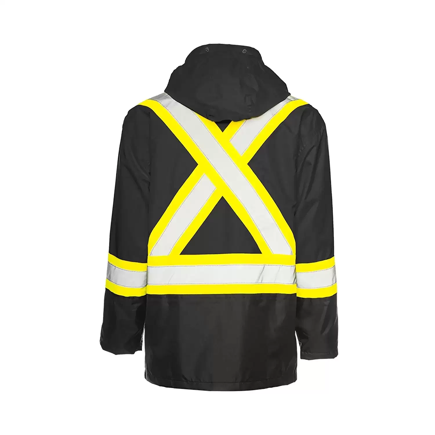 For comfort during long shifts, this Small black rain jacket includes a polyester mesh lining, adjustable cuffs, a detachable hood, and a 2-way front zipper under a storm flap. Reflective tape over contrast striping, including an X-pattern across the back, helps improve visibility from multiple angles for maintenance crews, site workers, yard staff, and off-road traffic applications.